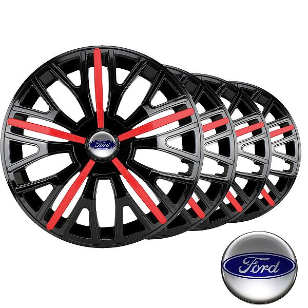 . Jogo calotas esportivas Elitte Triton Sport Black Red aro 13 emblema Ford - Ka Fiesta Focus Escort - 3510 - Peças Automotivas - Itália Ricambi Friso Lateral Carros Seminovos Forauto Ford Ford EcoSport 2018 ganha linha de acessórios